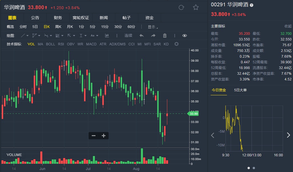 截至8月20日,润啤(00291)涨3.84%,报33.8港元。