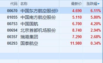 智通财经APP获悉,人民币兑美元汇率连续两日升值,现已升至6.85,此外,原油价格近期持续走弱,目前纽约油已跌破65美元,受此影响,航空板块今日走强。截至14时10分,中国东方航空(00670)涨6.11%,中国南方航空股份(01055)涨5.8%,中国国航(00753)涨4.2%。