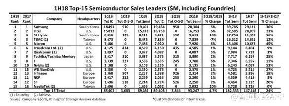 智通财经APP获悉,研究机构IC Insights今天发布了2018年上半年全球半导体供应商Top15榜单,三星、英特尔、SK海力士、台积电、镁光位居前五,相较于去年同期,这几家公司都有比较明显的增长,其中SK海力士业务同比增长56%,镁光同比增长45%,三星同比增长36%。