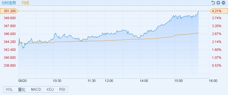 智通财经APP获悉,腾讯控股(00700)尾盘重上350港元,贡献恒指108点。截至15时41分,涨4.27%,报价351.4港元,成交额100.43亿。