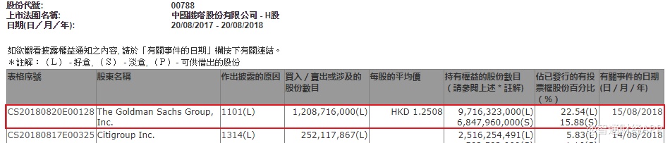 智通财经APP获悉,根据联交所资料显示,高盛于8月15日增持中国铁塔(00788)12.09亿股,每股作价1.25元,总值约15.12亿港元,最新持股比增至22.54%。