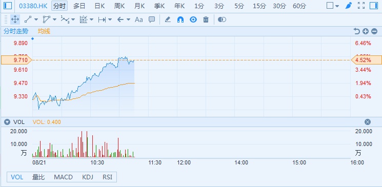 智通财经APP获悉,今日开盘后,龙光地产(03380)股价反复震荡,10点后其股价开始一路上扬,截至发稿,龙光涨4.52%,报9.71港元。