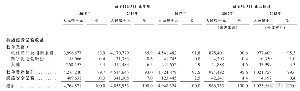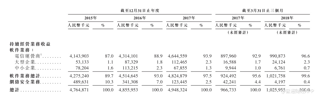 公司绝大部分收益来自软件业务及网络安全业务。2015年、2016年、2017年及截至2018年3月31日止3个月,软件业务来自电信运营商的收益分别占持续经营业务收益的87.0%、88.9%、93.9%及96.6%。