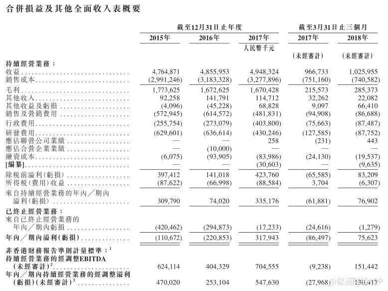 根据招股书,公司持续经营业务的收益由2015年的47.65亿元(人民币,下同)增长至2016年的48.56亿元,并进一步增长至2017年的49.48亿元。由截至2017年3月31日止3个月的9.67亿元增长6.1%至2018年3月31日止3个月的10.26亿元。2015年、2016年及2017年,公司年内溢利分别为3.09亿元、0.74亿元及3.35亿元。截至2018年3月31日止3个月,期内溢利为0.77亿元,而截至2017年3月31日止3个月,期内亏损人民币0.62亿元。