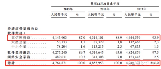 从公司分部业务收入情况来看,2015-2017年,公司从电信运营商客户获得的营收从41.44亿元(人民币,单位下同)增至46.45亿元,复合增长率为5.9%。