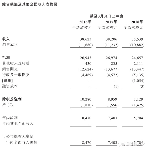 根据招股书,公司截至2016年3月31日止年度、2017年3月31日止年度及2018年3月31日止年度收入分别约为0.39亿新加坡元、0.38亿新加坡元、0.36亿新加坡元。期内毛利分别为0.27亿新加坡元、0.27亿新加坡元、0.25亿新加坡元。