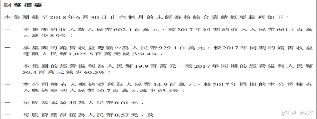 智通财经APP注意到,于8月20发布的公司上半年业绩报告显示,公司于期内实现收入为6.021亿元人民币(单位下同),同比减少8.9%;经营溢利1990万元,同比减少60.5%;公司拥有人应占溢利为1490万元,同比减少63.4%。