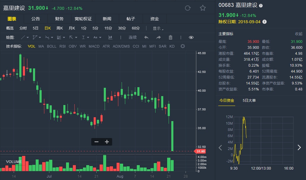 截至8月22日,嘉里建设(00683)跌12.84%,报31.9港元。