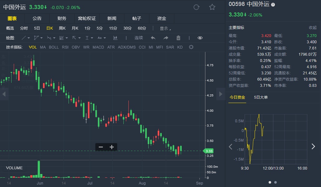 截至8月22日,中国外运(00598)跌2.06%,报3.33港元。