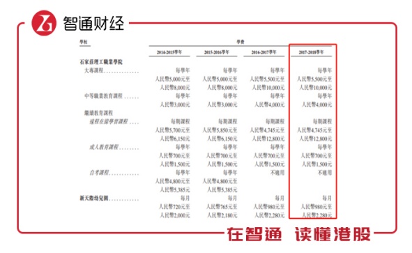 从学费增长的幅度看,高等教育之大专为10-25%,中职教育为33.3%,继续教育基本没变化,幼儿教育板块为14-36.1%。在非核心的辅导教育板块,费用也有增长,2017年的每辅导课时为90-230元,底价和顶价较2015年增加25-30元,增长幅度为15-38.5%。