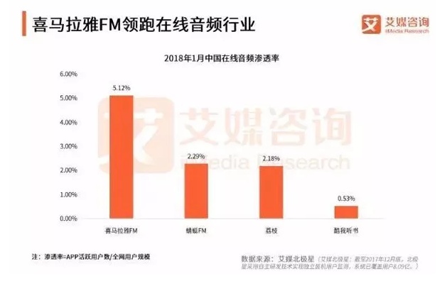 今年4月,艾媒咨询发布的《2017-2018中国在线音频市场研究报告》显示,截至2018年1月,中国在线音频渗透率(APP活跃用户数/全网用户规模)中,喜马拉雅FM以5.12%的成绩排名第一,蜻蜓FM、荔枝FM分别以2.29%、2.18%分列二、三位。