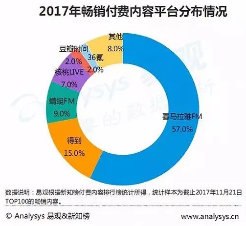 截至2017年底,喜马拉雅FM牢牢占据着知识付费市场半壁江山(见下图),得到排名第二,但其体量还不到喜马拉雅FM三分之一,蜻蜓FM位列第三。另据天眼查数据显示,当前喜马拉雅FM的竞品多达50家,值乎、知乎live、豆瓣时间等知名付费平台,都在虎视眈眈意欲吃下这块肥肉。