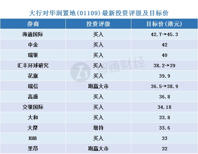 智通财经APP整理,大行对华润置地(01109)最新投资评级及目标价如下: