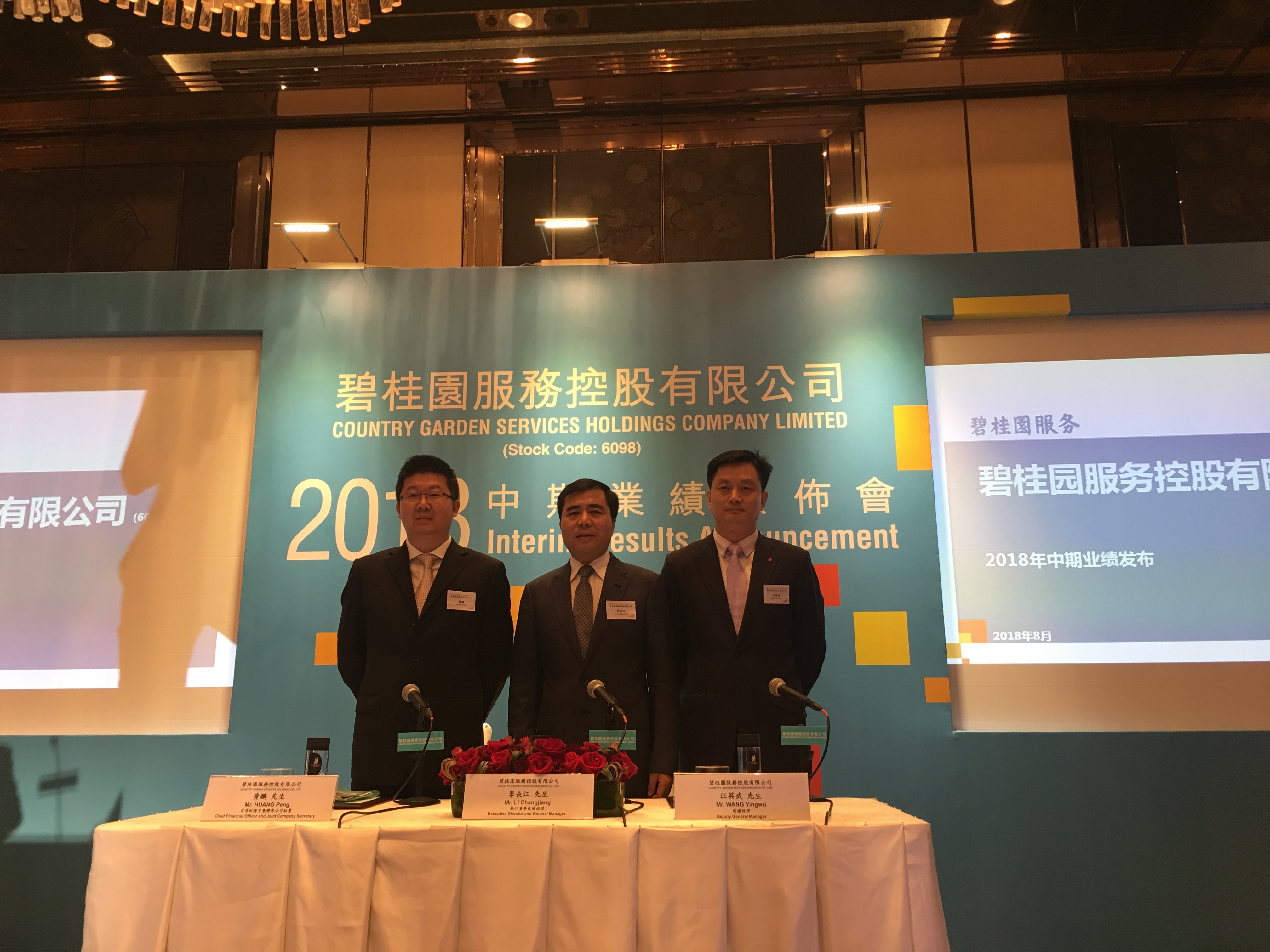 (从左至右为:碧桂园服务CFO兼联席公司秘书黄鹏、执行董事兼总经理李长江、副总经理汪英武)