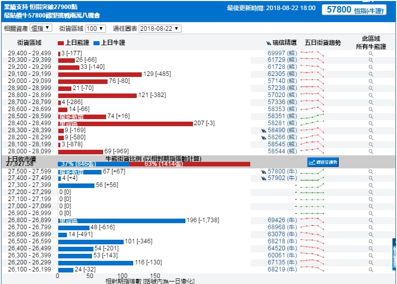 智通财经APP获悉,截至8月22日,恒指最新的牛熊街货比例为37:63。从瑞信恒指牛熊证街货分布图中得到的数据显示,熊证街货重货区在28400-284199区间,此区间最新的熊证数量为207张,比上一交易日减少3张;最多新增区间在28500-28599,比上一交易日新增16张。牛证中重货区在26800-26899区间,该区间最新牛证数量为196张,比上一交易日减少1738张。牛证最多新增区间在27500-27599区间,新增67张。
