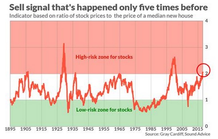 同时,智通财经APP还发现,由《忠告》(Sound Advice)时事通讯编辑Gray Cardiff提出的“忠告风险指标”,在1895年以来发出了第六次卖出信号,或预示美股将触顶并崩跌至少50%。该指标主要衡量标普500指数股价与美国新屋价格中位数的比值。当该指标升破2.0时,意味着股市吸收了更大比例的可得投资资本,超过了经济状况可以合理化的程度,因此代表“股市正处于即将下跌的危险中”。
