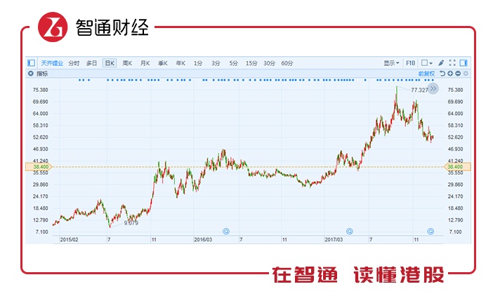 净利润方面,由2015年的4.28亿元大幅飙升至2017年的34亿元,三年时间增幅接近700%,即2015-2017年的净利润年复合增长率高达181.8%。值得一提的是,强劲的经营业绩表现,也让天齐锂业的A股股价从中受惠,其股价由2015年初10.259元已大幅攀升至2017年年底的53.01元,累计涨幅超417%。