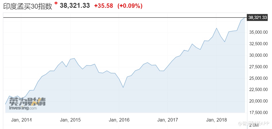 其年线走势非常强悍,该指数从上世纪70年代末创设以来,基本处于长期牛市态势,只在1995年、2000年、2008年和2011年有显著回撤。从指数起始日算起,孟买30指数从100点,升至目前的38321.33点,涨幅超过382倍,远超美股。
