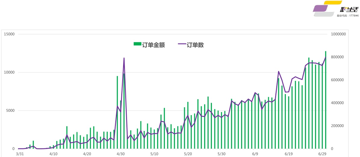 (从3月31日至6月30日,彩惠人生订单金额和订单数走势图)