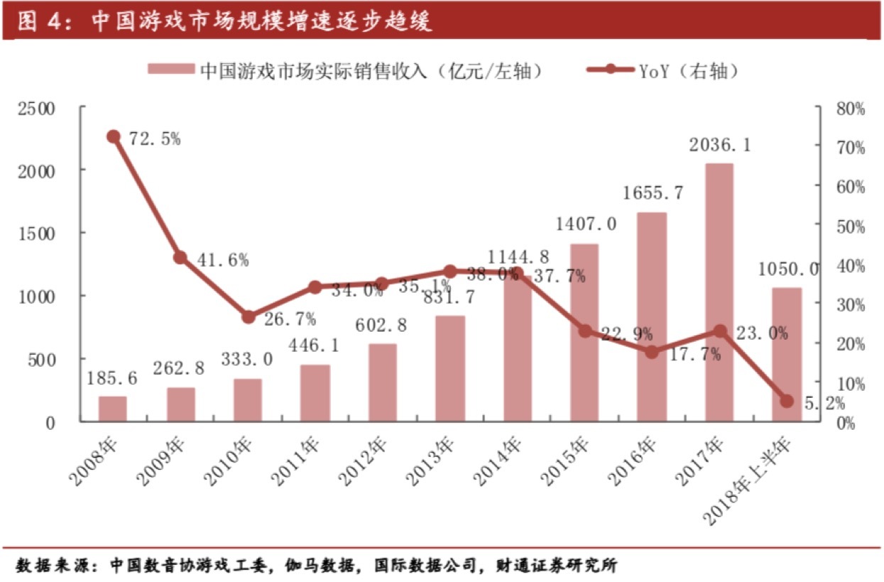 根据伽马数据,2018年中国游戏市场增速仅为 5.2%,创十年新低,行业的逻辑由增量转向存量。在存量的搏杀中,腾讯和网易龙头地位将愈发巩固,中小企业在国内市场将愈发难以弯道超车。