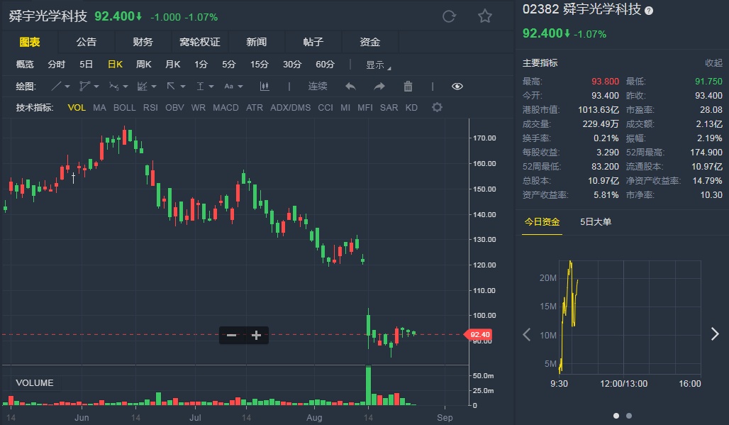 截至8月24日10:15,舜宇跌1.07%,报92.4港元。