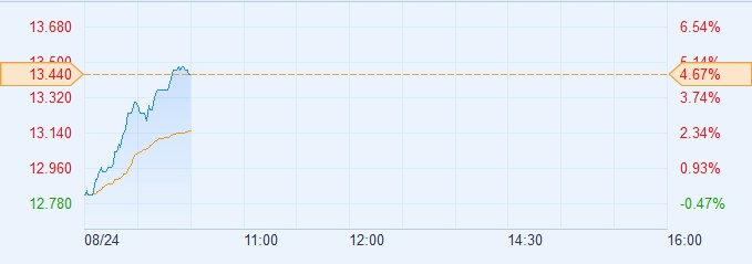 智通财经APP获悉,中国海洋石油(00883)上半年净利同比增长56.8%,盘中涨幅近5%,截至10:26,涨4.98%。报13.48港元,成交额5.78亿港元。