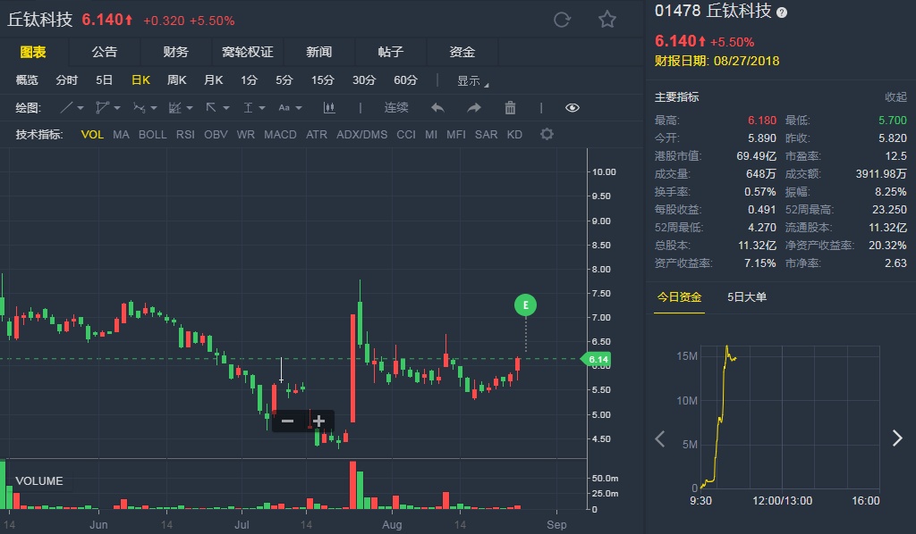 截至8月24日10:38,丘钛科技涨5.5%,报6.14港元。
