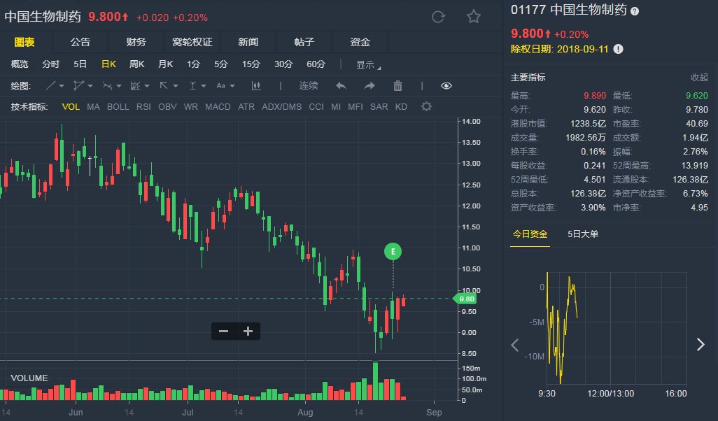 截至8月24日10:45,中生制药涨0.2%,报9.8港元。