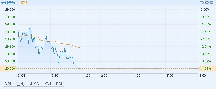 智通财经APP获悉,白云山(00874)昨日公布中期业绩,王老吉销量同比增长仅12%,逊于市场预期。股价持续下滑,截至11时20分,跌4.02%,报价28.65港元,成交额3715.93万。