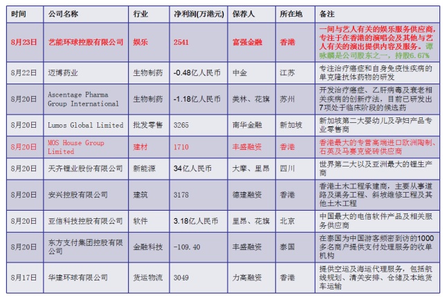其中8月23日递表的艺能环球控股是一家与艺人有关的娱乐服务供应商。谭咏麟是旗下艺人同时也是公司股东之一,具备成为超级热门股的潜质,你值得期待!
