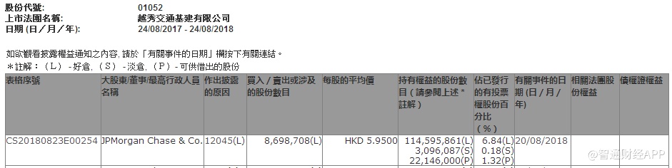 智通财经APP获悉,根据联交所资料显示,摩根大通于8月20日减持越秀交通基建(01052)869万股,每股作价5.95元,总值约5170万元,最新持股数目约1.14亿股,最新持股量减至6.84%。