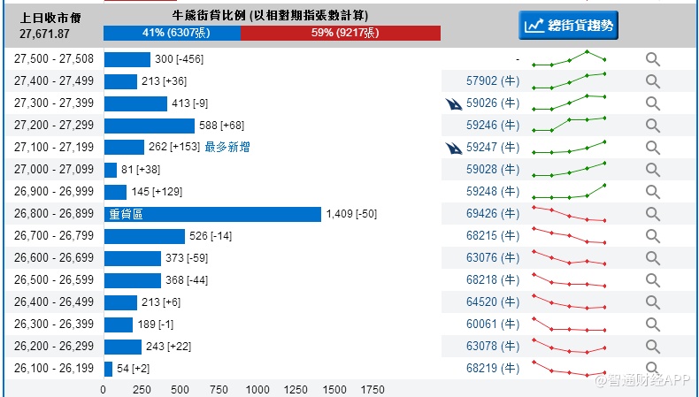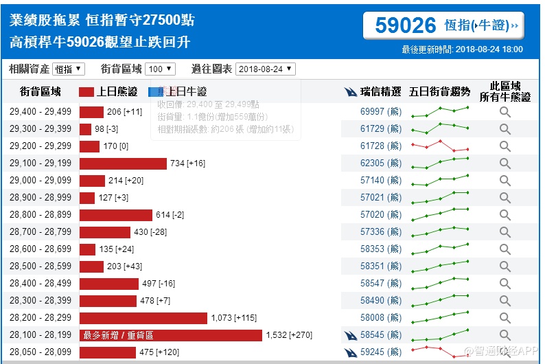 智通财经APP获悉,截至8月24日,恒指最新的牛熊街货比例为41:59。从瑞信恒指牛熊证街货分布图中得到的数据显示,熊证街货重货区及最多新增区间在28100-28199,比上一交易日新增270张。牛证中重货区在26800-26899区间,该区间最新牛证数量为1409张,比上一交易日减少50张。牛证最多新增区间在27100-27199区间,新增153张。