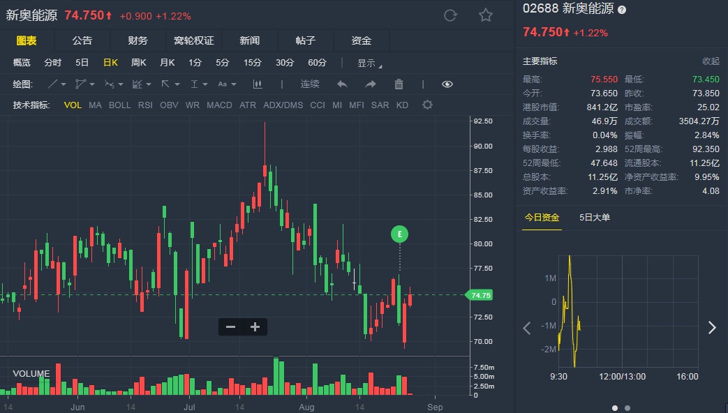 截至8月27日10:24,新奥能源涨1.22%,报74.75港元。