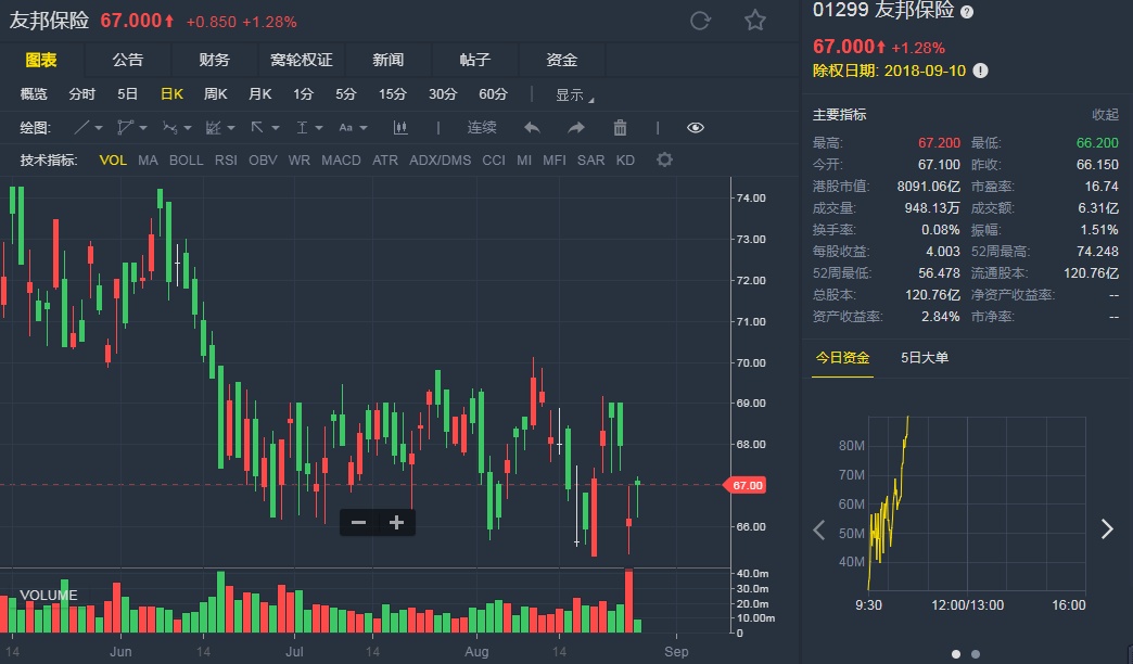 截至8月27日10:33,友邦保险涨1.28%,报67港元。