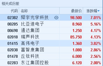 智通财经APP获悉,手机供应链全线上涨,截至11时02分,舜宇光学(02382)涨7.01%,报价98.5港元,比亚迪电子(00285)涨5.16%,报8.96港元,通达集团(00698)、瑞声科技(02018)涨逾4%,高伟电子(01415)涨3.82%,报1.36港元。
