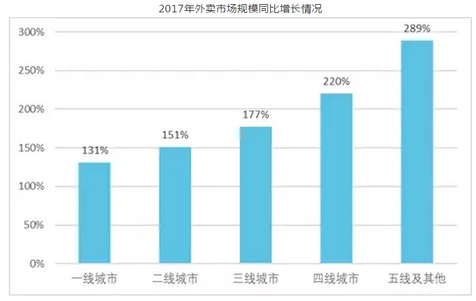 据统计,2017年中国外卖市场总收入达2091亿元人民币,13年至17年复合增长率45.6%。根据中国餐饮市场报告,预计2022年中国外卖市场总收入将至4770亿人民币,占中国餐饮市场的7.6%,各线城市全面开花的局面有望持续。