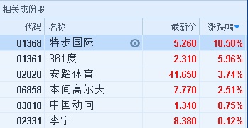 智通财经APP获悉,体育用品股全线上涨,截至13时48分,特步国际(01368)涨10.5%,报价5.26港元,361度涨5.96%,报2.31港元,安踏体育(02020)涨3.74%,报41.65港元。