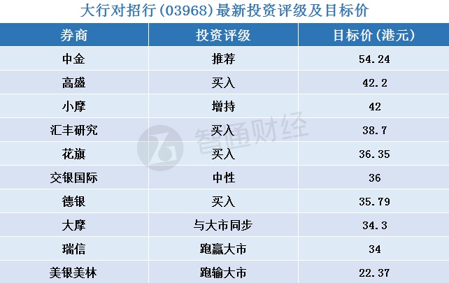 经智通财经APP整理,大行对招商银行(03968)最新投资评级及目标价如下,