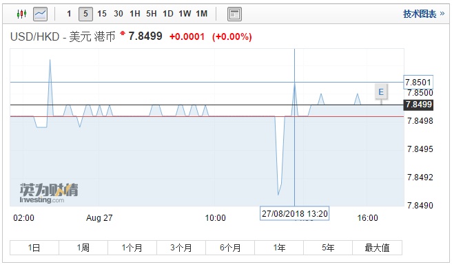 今日美元兑港元一度触及7.85弱方兑换保证线,截至收盘,美元兑港元报7.8499。