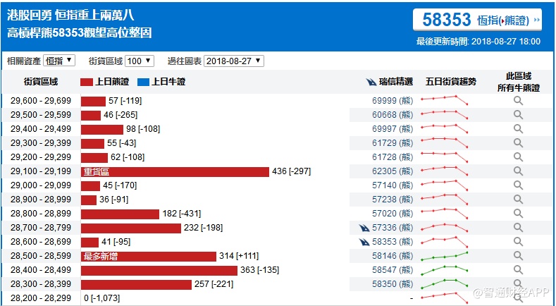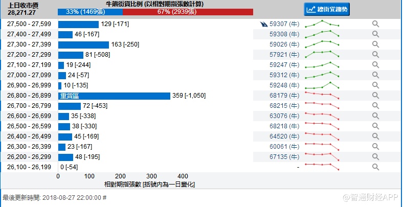 智通财经APP获悉,截至8月27日,恒指最新的牛熊街货比例为33:67。从瑞信恒指牛熊证街货分布图中得到的数据显示,熊证街货重货区在29100-29199区间,该区间熊证数量为436张,比上一交易日减少297张,最多新增区间在28500-28599,比上一交易日新增111张。牛证中重货区在26800-26899区间,该区间最新牛证数量为359张,比上一交易日减少1050张。
