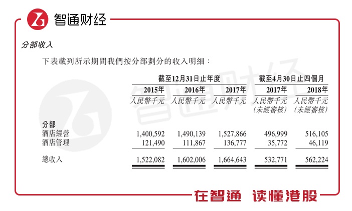 对比开元酒店2015年至2018年4月底营收情况,酒店经营收入占总收入的占比分别为:92.0%、93.0%、91.8%、93.3%以及91.8%;而酒店管理收入占总收入的占比分别为:8.0%、7.0%、8.2%、6.7%以及8.2%,其中酒店经营平均收入占总收入的比重超过92%。