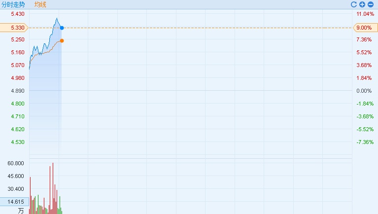 截至10时00分,涨9.41%,报价5.35港元,成交额2933万 。