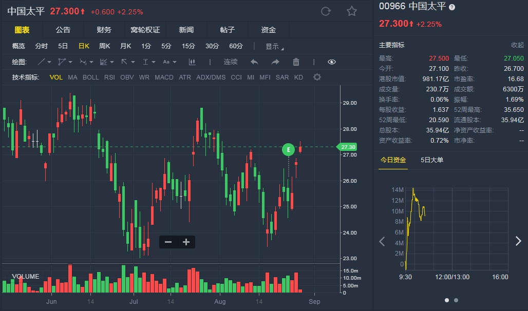 截至8月28日10:36,中国太平涨2.25%,报27.3港元。