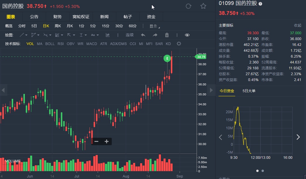截至8月28日11:10,国药控股涨5.3%,报38.75港元。