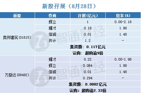 截至8月28日,正在招股的新股中,辉立、耀才、信诚3家券商为建筑承包商奥邦建筑(01615)借出孖展金1.2亿港元,超购逾9倍;为万励达(08482)借出孖展金0.294亿港元,超购逾2.33倍。具体情况如下: