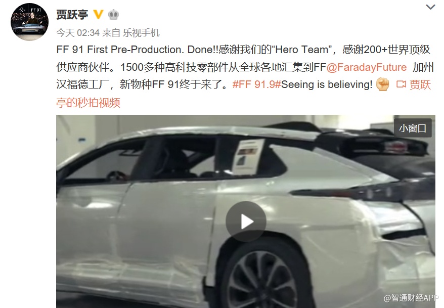 他在微博中写道“感谢FF的‘Hero Team’,感谢200+世界顶级供应商伙伴,1500多种高科技零部件从全球各地汇集到FF加州汉福德工厂,新物种FF91终于来了。”