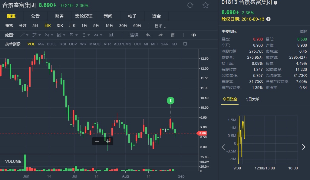 截至8月29日10:14,合景泰富跌2.36%,报8.69港元。