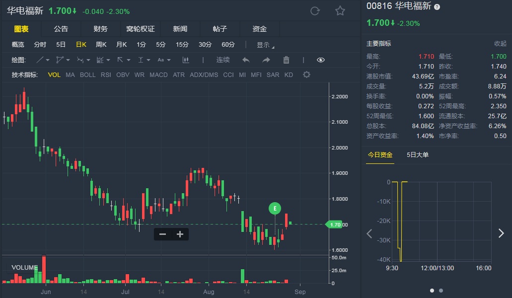 截至8月29日10:24,华电福新跌2.3%,报1.7港元。