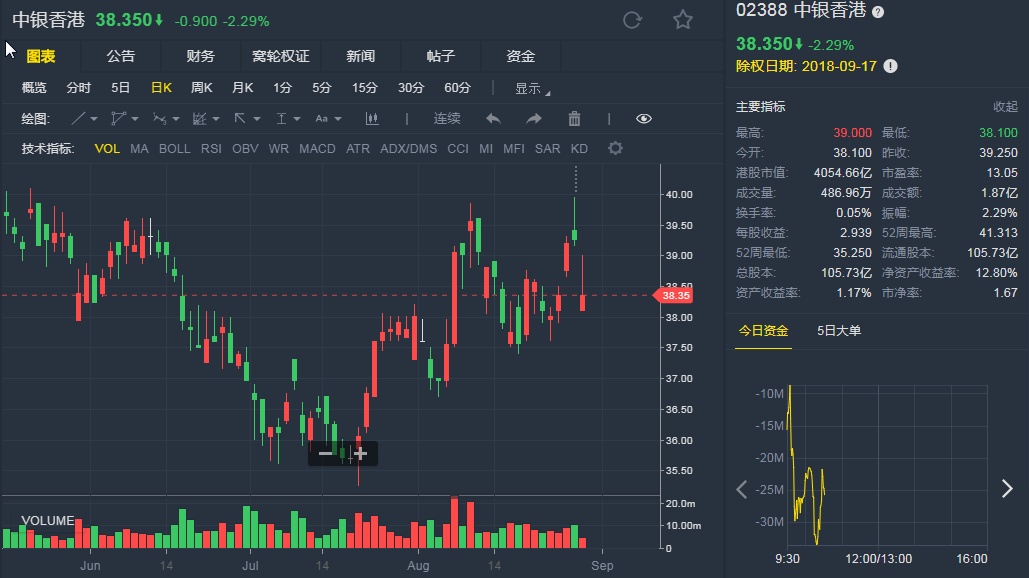 截至8月29日10:33,中银香港跌2.29%,报38.35港元。