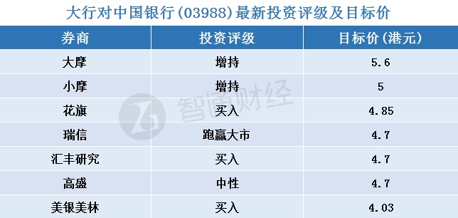 经智通财经APP整理,大行对中行(03988)最新投资评级及目标价如下,